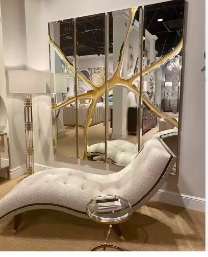 The Khaleesie Mirror Set of 4 is a striking statement piece, showcasing four hand-carved beveled mirrors with a unique cracked motif, set against a luxurious Exotic Gold backdrop. Designed for versatility, this exquisite piece can be displayed either vertically or horizontally, adding elegance and sophistication to any space.