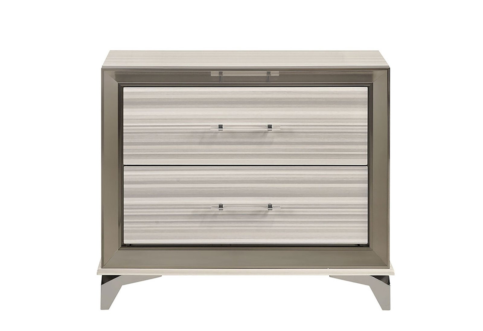 - Components: The collection includes a bed with an upholstered headboard, a nightstand, a dresser with an LED mirror, and a chest.