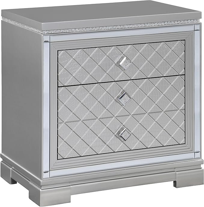 Clean lines and luxe details shine through in this two-drawer nightstand. Sparkling accents like a reflective mirror trim outlining the set of drawers and square knobs encrusted with diamond-like accents create a regal display against a bed. This glam nightstand opens itself up to whatever color palette you prefer and offers hidden extras like USB charging ports and a felt-lined top drawer for delicate accessories and jewelry. Lending to the understated white finish is textured drawer fronts embossed in a wild crocodile and diamond pattern. Along the top just below the tabletop surface is a slim crystal-like molding that completes the piece and mirrors the hardware.