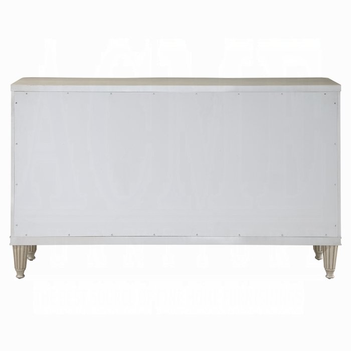 Give your dining space a much-needed storage solution with the Elyssa server. This server features three ample drawers and two side cabinets for all your extra dishware, glassware, and linens. The drawers showcase synthetic leather quilted drawer fronts. The piece sits on eight beautifully crafted fluted wooden legs. It is finished in a champagne color that adds a stylish touch.