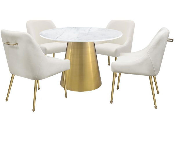Freshen up your elegant dining room with the luxurious look and feel of genuine marble. This modern dining table pairs a round silhouette with beautiful white marble complete with light grey veining that offers organic elegance and dimensionality. This striking table stands on a conical pedestal base that receives a gleaming gold finish that radiates warmth and sophistication. This table is a stunning addition in a formal dining space, offering refined character to family and friends. The pairing of cool marble and warm brushed gold strikes a perfect balance.