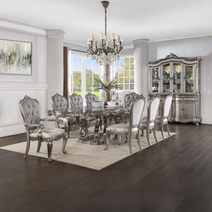 Introducing our Ariadne dining table that is sure to captivate you with its intricate scrollwork and luxurious antique platinum finish. This stunning dining table has a beautifully crafted pedestal base that makes a grand statement on its own. Creating the perfect setting for gathering around friends and family. The table includes an extension leaf that will help you accommodate all your guests.
