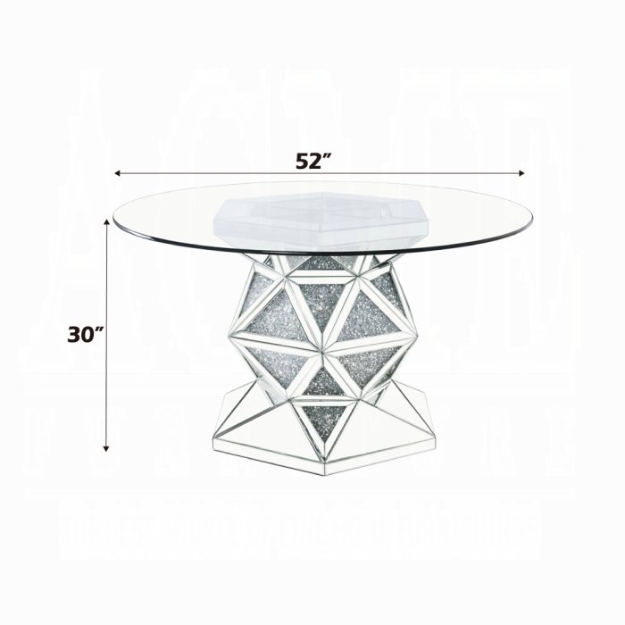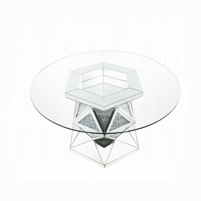 The Noralie dining set is the perfect centerpiece for any social gathering. A clear glass top keeps the focus on the sparkling faux diamond inlay of the pedestal table base. Matching side chairs feature curved cabriole legs in a stainless steel finish that complements the reflective mirror trim of the multi-faceted pedestal table base. Create a chic dining space that radiates dramatic ambience with the Noralie dining set.