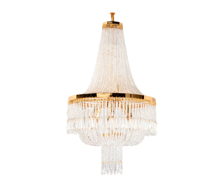The Beaumont Chandelier exudes elegance and grandeur. This chandelier is characterized by its ornate design, featuring a gold metal accent that adds a touch of sophistication and luxury.