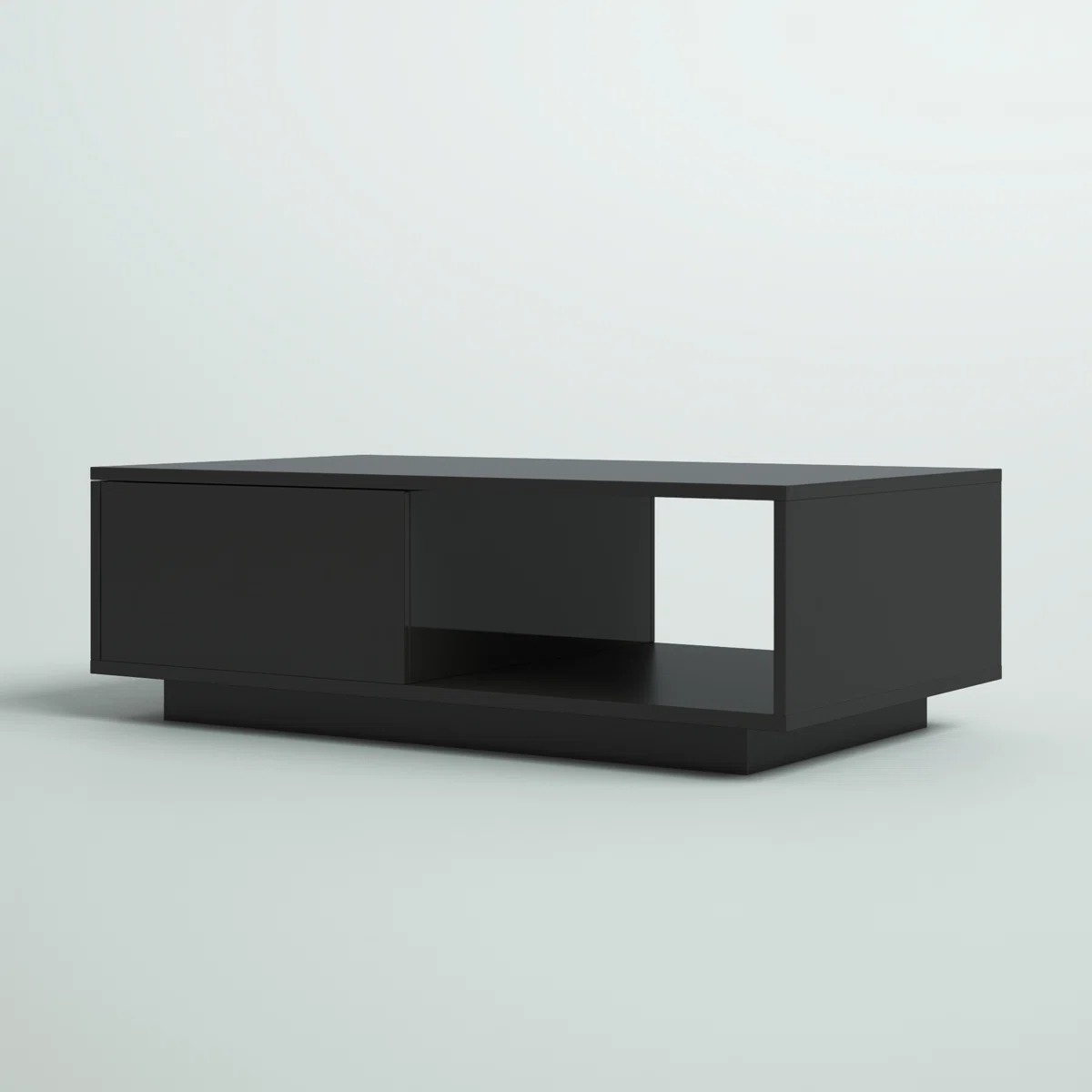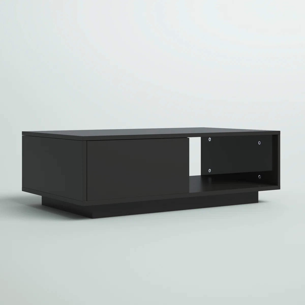 This coffee table with storage gives you an ultramodern centerpiece for your living room, office, store, or bedroom, with its clean-lined silhouette and flashy LED lights at the base. It's crafted from engineered wood, and it comes in a glossy finish that blends in with a variety of styles and color schemes. One open shelf provides you with space to stack magazines or store board games, while two adjacent drawers offer another spot to keep items out of sight. The plinth base features built-in lighting in 16 colors to suit your mood. It's also scratch- and stain-resistant, making this table great for high-traffic areas.