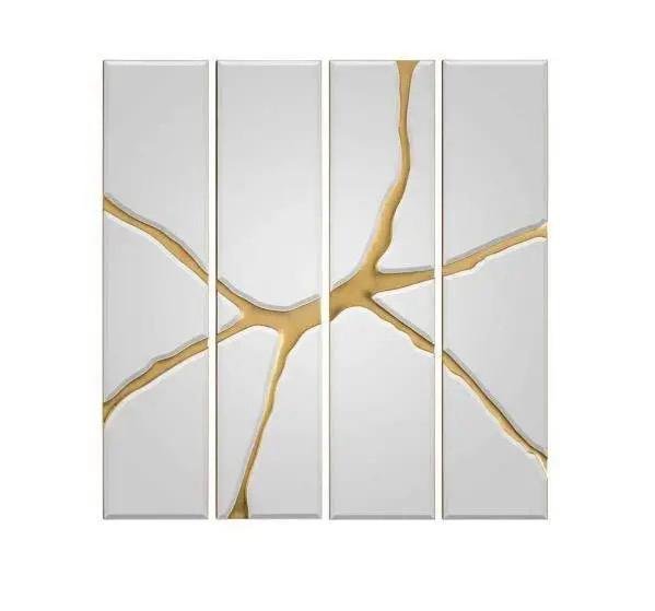 The Khaleesie Mirror Set of 4 is a striking statement piece, showcasing four hand-carved beveled mirrors with a unique cracked motif, set against a luxurious Exotic Gold backdrop. Designed for versatility, this exquisite piece can be displayed either vertically or horizontally, adding elegance and sophistication to any space.