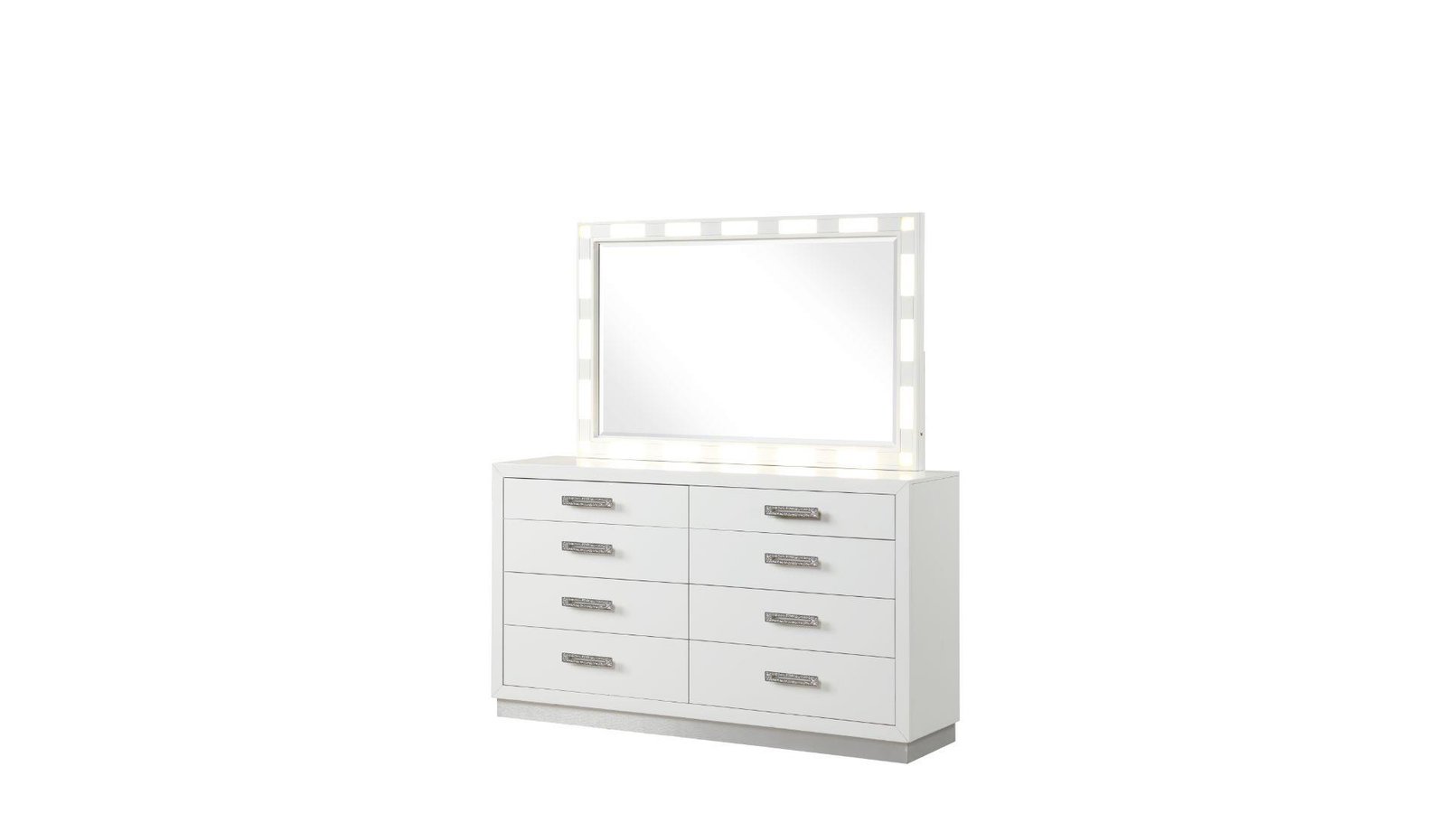 We are proud and excited to introduce our newest addition to our thoughtfully crafted bedroom sets. This premium bedroom set features a superb design that integrates sophistication with simplicity. This set is a definition of clean style and modern feeling to your bedroom. Its cutting-edge profile is dressed in subtle detailing and plush upholstery. This Collection features a King Bed, one nightstand, and 8-drawer dresser with mirror. What really sets this bedroom set apart from the others is the Built-in LED ambient nightlight on the headboard, side rails, and the mirror. These unique LED lights will elevate your bedroom setting to a whole another level. The dresser have jewelry sections in their drawers to store your beautiful, valuable jewelry. There is extra support for drawers to handle bulky items, and the drawer pulls has crystal bling style diamond hardware. There is enough storage in all the case pieces to store your essentials and much more. This bedroom set is not just beautiful but also long-lasting; the engineered hardwood provides superior strength and durability. Indulge in the gorgeous sophistication while awake and in restful sleep at the end of each day.