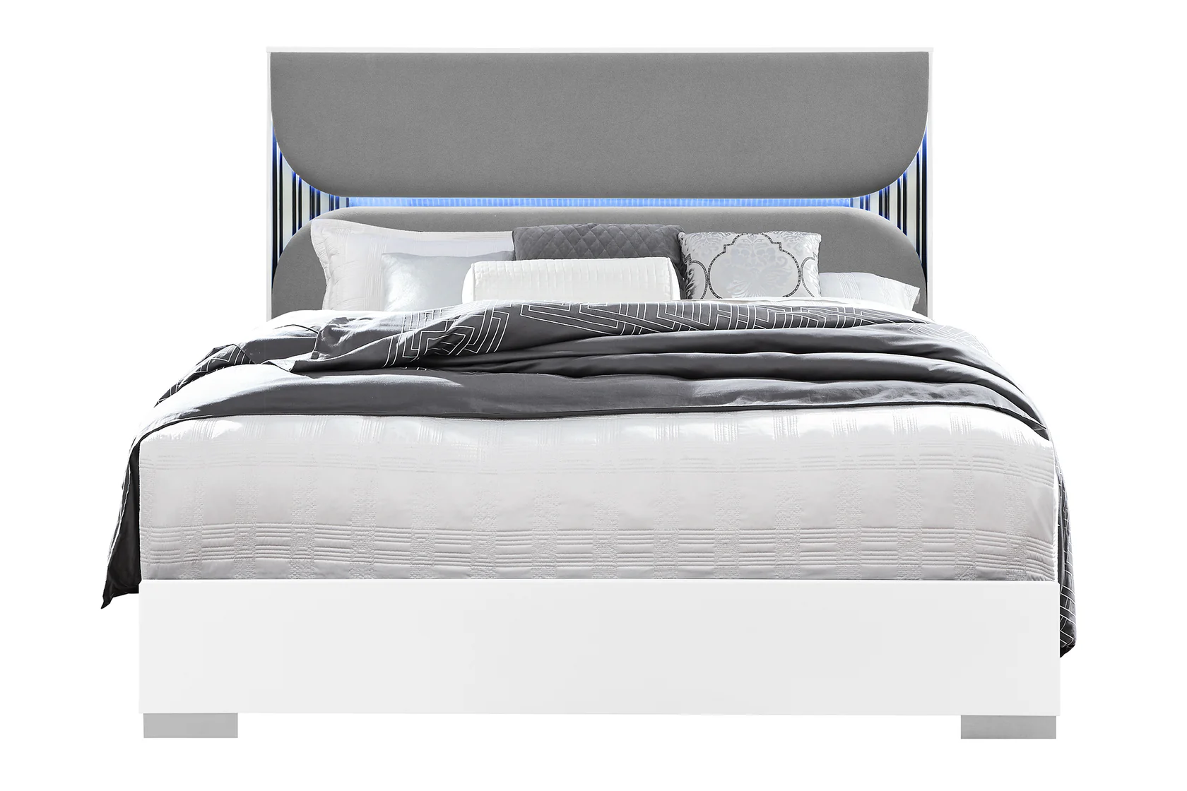 The collection features a modern design with a sleek white finish and chrome accents. The centerpiece is a bed with an upholstered headboard that includes built-in LED accent lighting. The other pieces, such as the dresser, chest, and nightstand, have textured drawer fronts and chrome hardware.