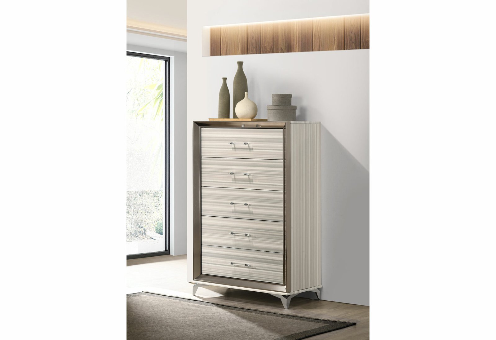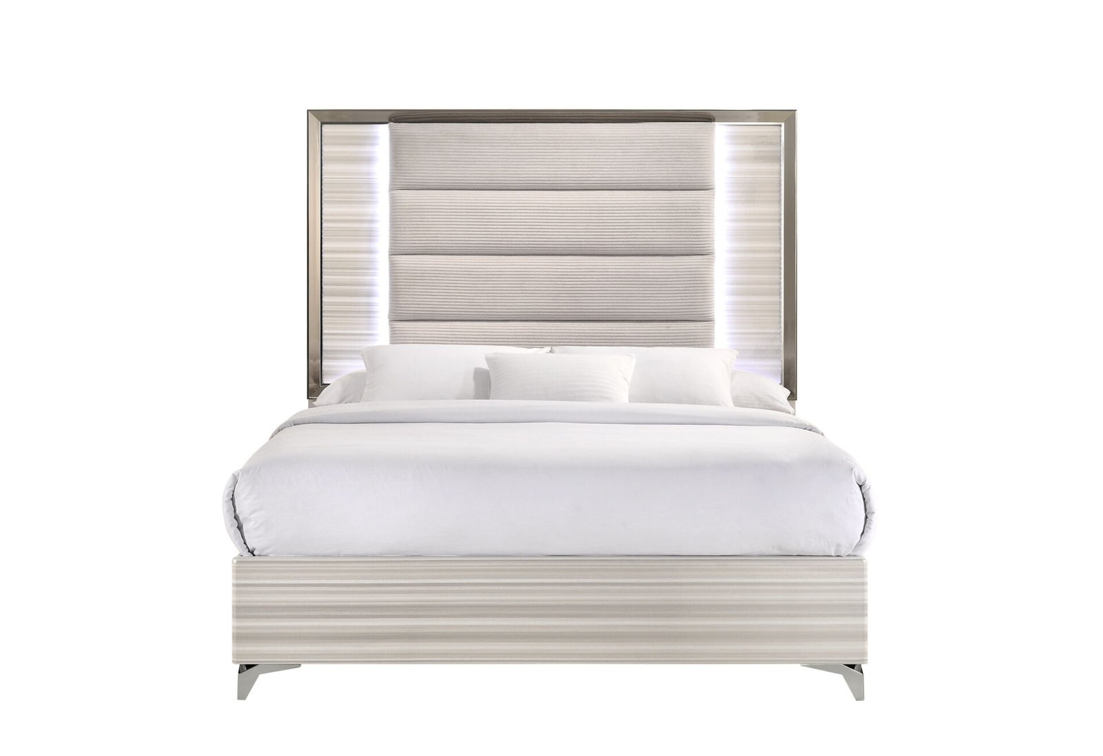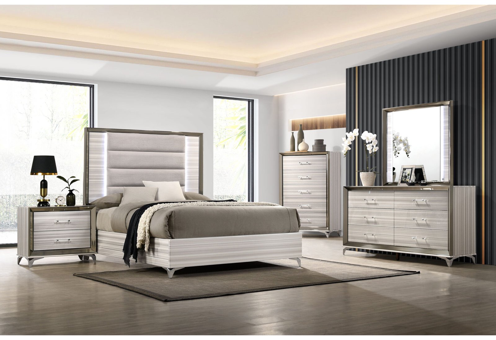 - Components: The collection includes a bed with an upholstered headboard, a nightstand, a dresser with an LED mirror, and a chest.
