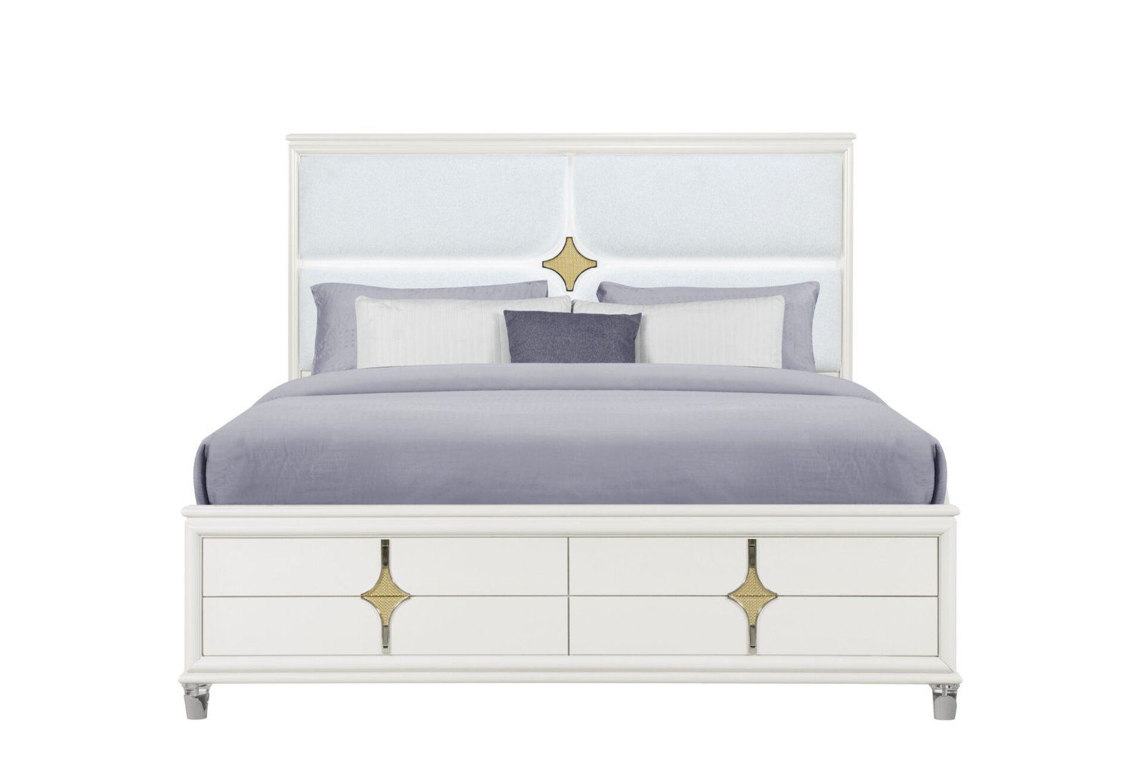 The Orion Bedroom Collection, a stunning blend of modern design and luxurious details. Finished in a sleek white, each piece in this collection features textured drawer fronts and hidden drawer pulls, complemented by elegant gold accents and acrylic legs. The collection’s standout features include LED accent lighting on both the bed’s upholstered headboard and the mirror. With its contemporary aesthetic and sophisticated touches, the Orion Bedroom Collection is truly a showstopper.