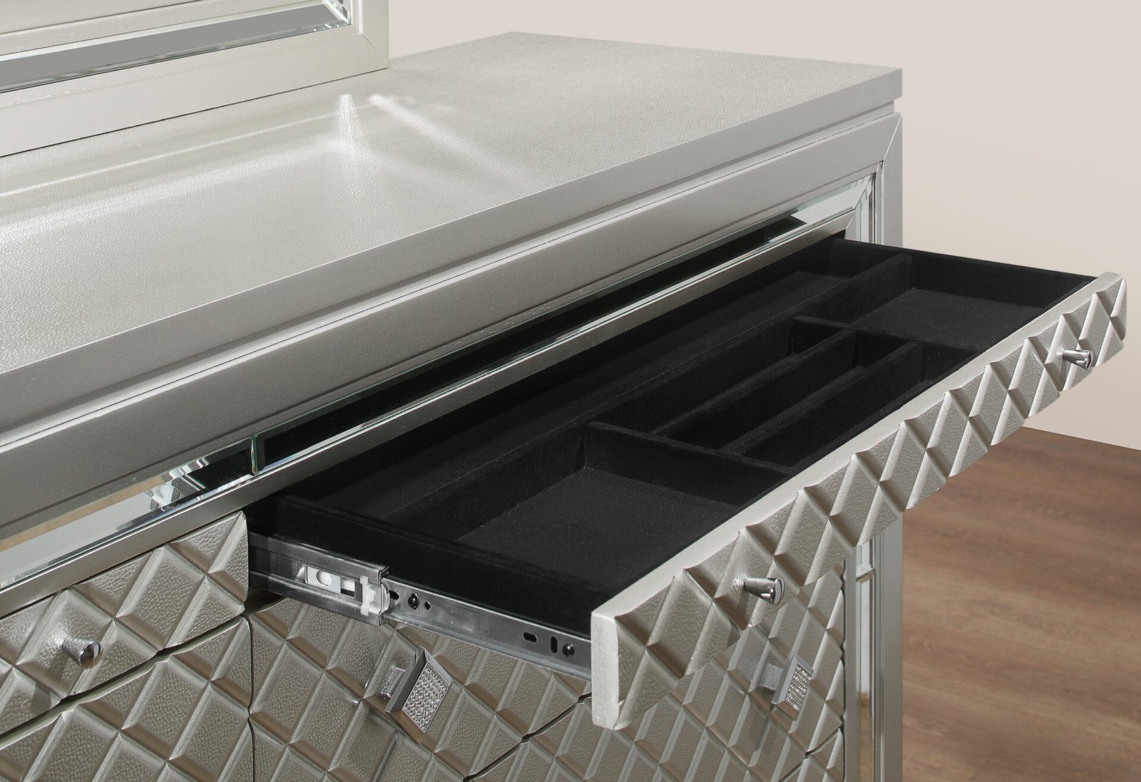 Old Hollywood Glam styling with all of the modern day features that today's consumer has come to expect. From the eye-catching platinum metallic finish to the fancy acrylic legs and ambient LED lighting, the Paris bedroom collection is a true showstopper.