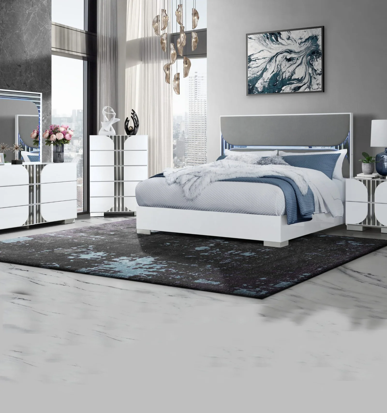 - Bed: Available in Queen and King sizes, with LED lighting in the headboard.