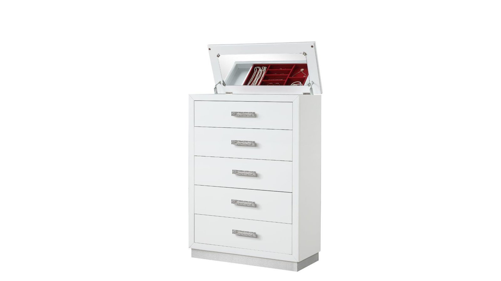 The chest have jewelry sections in their drawer’s There is extra support for drawers to handle bulky items. The drawer pulls has crystal bling style diamond hardware. 5-drawer chest with Metal Handle. There is enough storage in all the case pieces to store your essentials and much more. The Chest have jewelry sections in their drawers to store your beautiful, valuable jewelry.