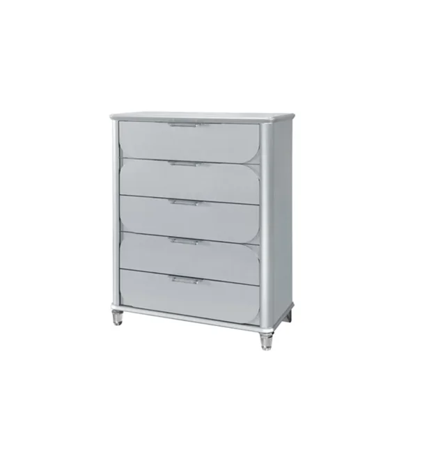 Enhance your bedroom with the contemporary elegance of the Lando Bedroom Collection . This stunning collection is finished in a sophisticated grey hue and embellished with chic acrylic accents, offering a perfect blend of modern design and luxurious detailing. The centerpiece bed features an upholstered headboard with acrylic trim and integrated LED accents, creating a captivating focal point. The mirror also boasts LED accents, adding a touch of modern flair. The dresser includes two hidden jewelry drawers for discreet storage, while the other case pieces are designed with full extension drawers, top felt-lined drawers, and textured drawer fronts for added style and functionality. The Lando Bedroom Collection is designed to be a showstopper, bringing both elegance.