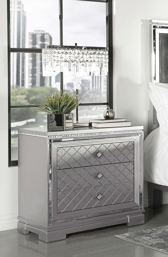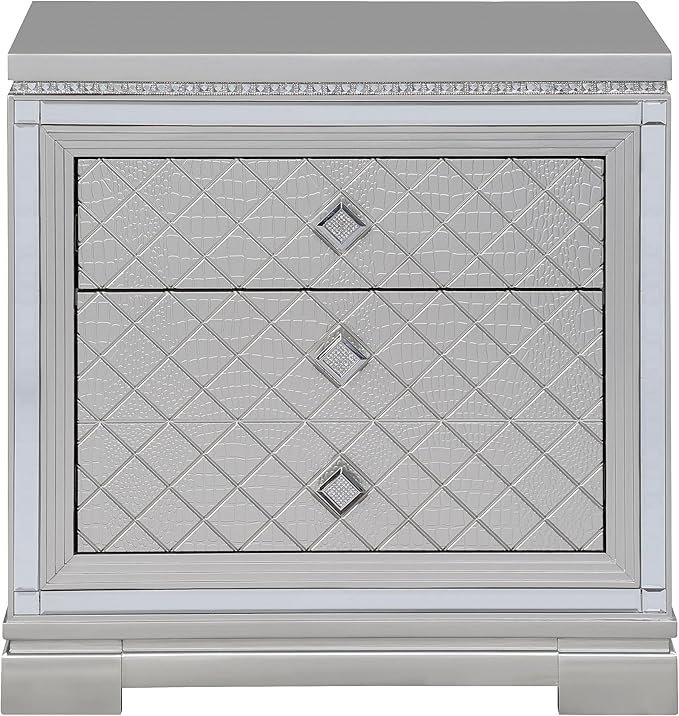 Clean lines and luxe details shine through in this two-drawer nightstand. Sparkling accents like a reflective mirror trim outlining the set of drawers and square knobs encrusted with diamond-like accents create a regal display against a bed. This glam nightstand opens itself up to whatever color palette you prefer and offers hidden extras like USB charging ports and a felt-lined top drawer for delicate accessories and jewelry. Lending to the understated white finish is textured drawer fronts embossed in a wild crocodile and diamond pattern. Along the top just below the tabletop surface is a slim crystal-like molding that completes the piece and mirrors the hardware.