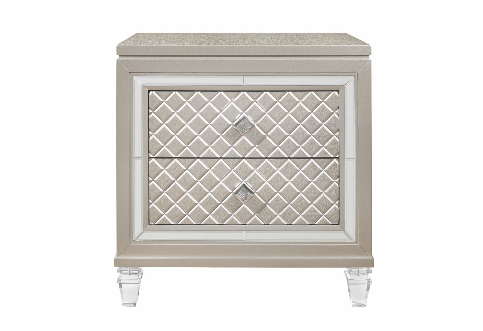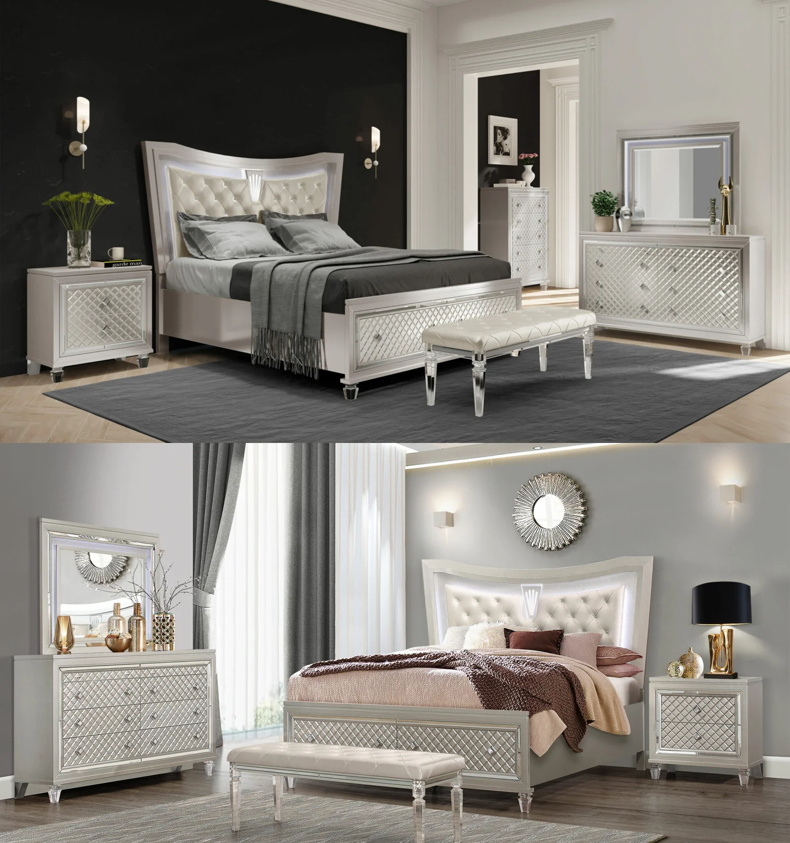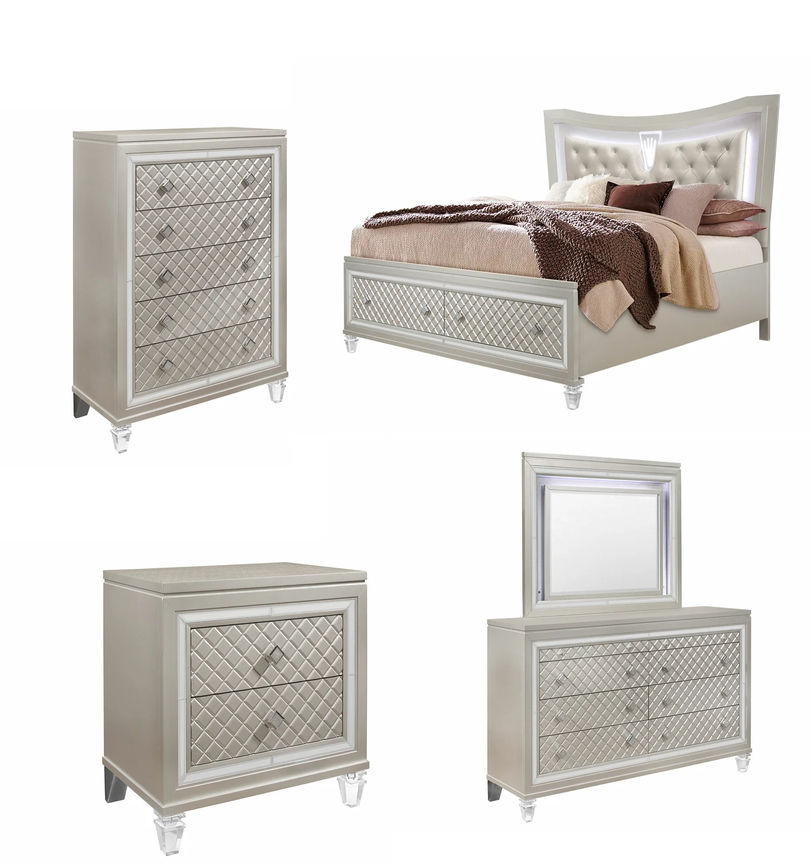Old Hollywood Glam styling with all of the modern day features that today's consumer has come to expect. From the eye-catching platinum metallic finish to the fancy acrylic legs and ambient LED lighting, the Paris bedroom collection is a true showstopper.