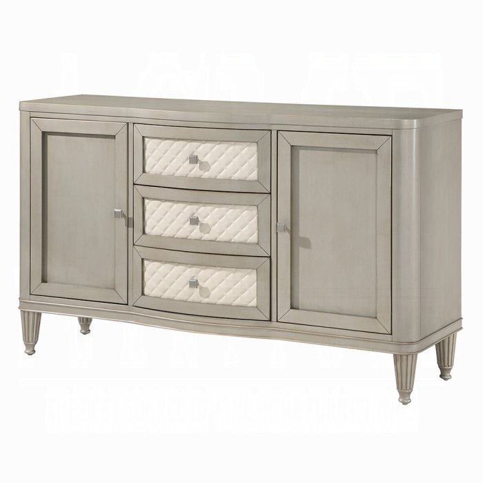 Give your dining space a much-needed storage solution with the Elyssa server. This server features three ample drawers and two side cabinets for all your extra dishware, glassware, and linens. The drawers showcase synthetic leather quilted drawer fronts. The piece sits on eight beautifully crafted fluted wooden legs. It is finished in a champagne color that adds a stylish touch.