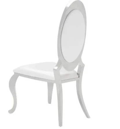 This dining chair blends classic form with modern materials for a bold statement. An oval backrest and gently flared silhouette evoke traditional influence, while the stainless steel frame and Queen Anne cabriole legs add a sculptural presence. Upholstered in smooth white faux leather, the cushioned seat and back provide comfort with easy care. The polished chrome finish completes the look with reflective shine and visual contrast.