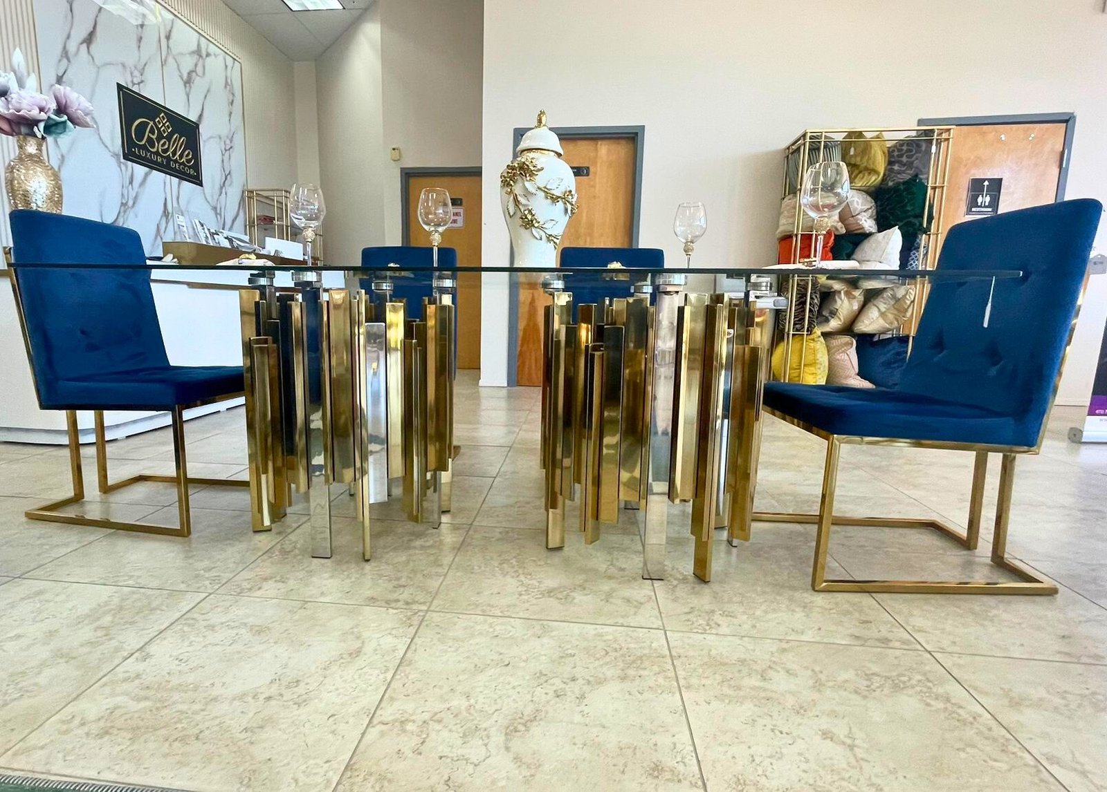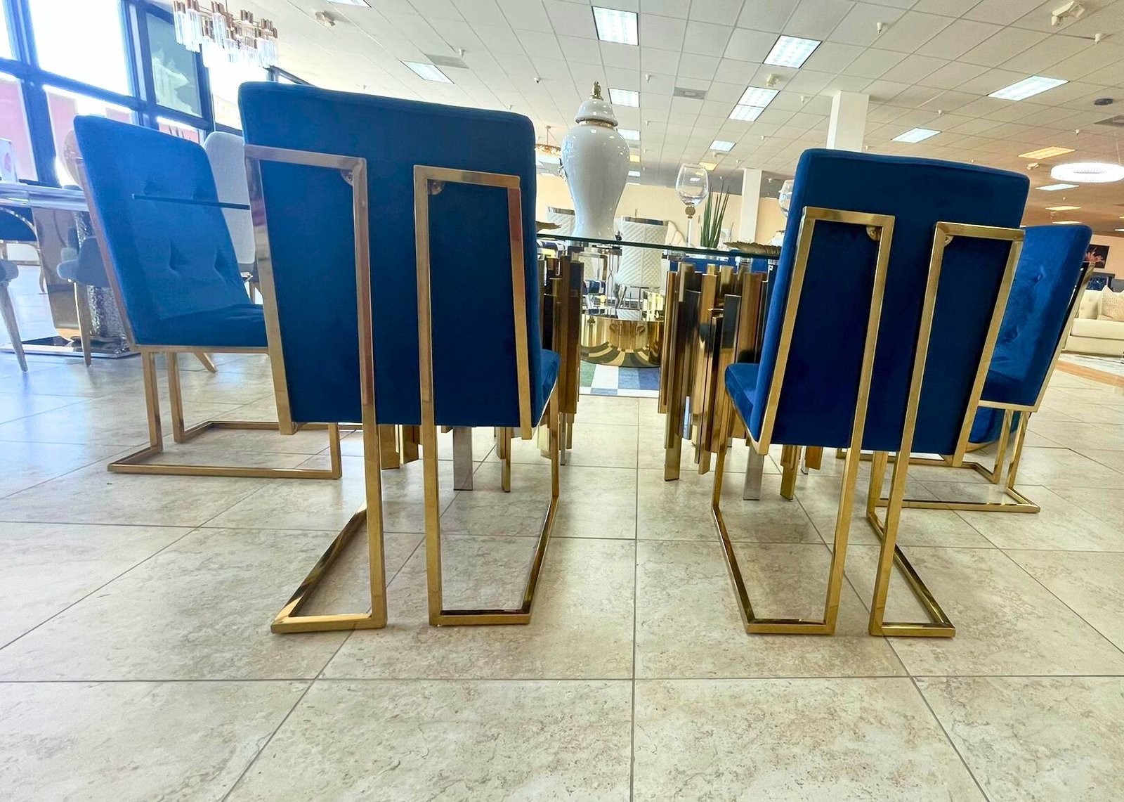 | Bold color and radiant metallic from this armless dining chair create a stunning visual. Arranged elegantly, sleek and metallic gold legs create an open feel. Plush blue cushions fill the seat and back, elevated with button tufts. Bold colors and angles meet to create a luxurious piece that adds style and comfort. Dine with a chic, art deco-inspired twist. |