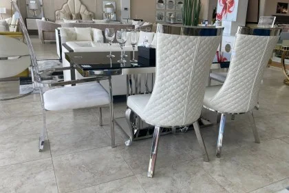 Command attention with the Camilla Dining Chair, a striking blend of timeless elegance and modern refinement. Wrapped in crisp white faux leather with diamond-stitched quilting, this high-back chair offers both visual depth and exceptional comfort. The polished chrome accents and sculptural Stainless steel legs add a regal touch, making it a standout piece for luxury dining rooms or contemporary interiors. With Camilla sophistication is always in style.