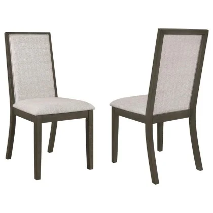 Experience luxurious comfort while dining with our beige upholstered side chairs. The chic dark grey finish perfectly complements the subtlety and elegance of our transitional dining set. These chairs not only offer a stylish seating option but also provide a cozy and inviting atmosphere. Elevate your dining experience with these exquisite side chairs that effortlessly blend comfort and sophistication.