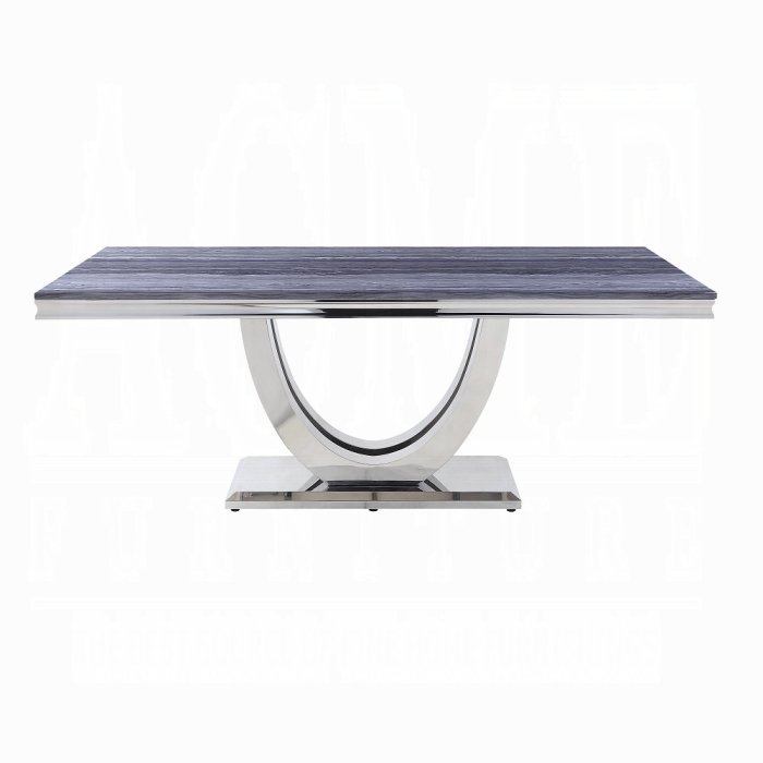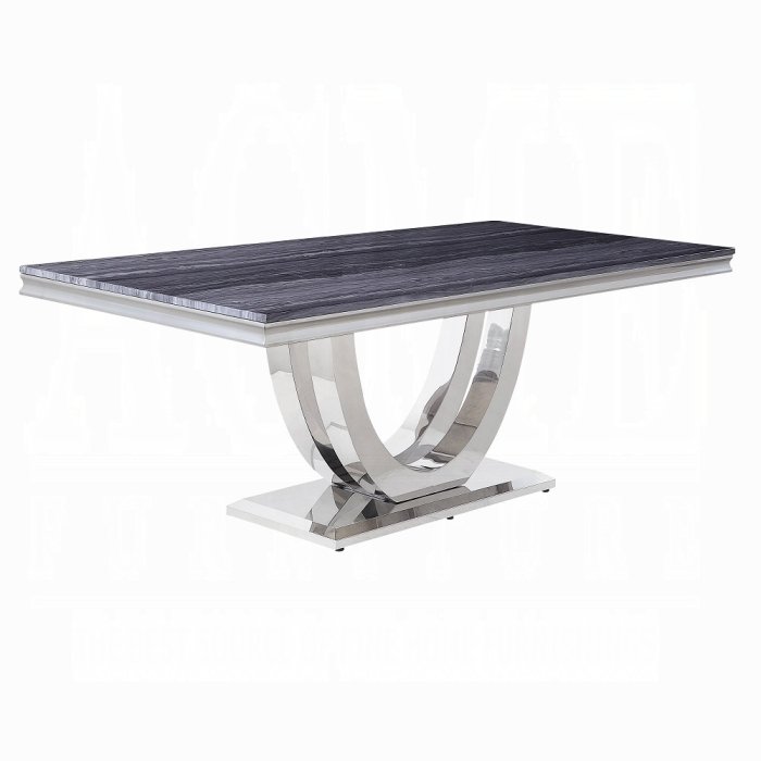 Update your dining space with the Cambrie dining collection. The table features an eye-catching metal geometric pedestal base that is sure to leave your dinner guests impressed. The ample faux marble tabletop adds more visual interest to the piece. The matching dining chairs are fully padded for maximum comfort while eating and after-dinner chat. Upholstered in lush velvet and have diamond stitching for a luxurious finishing touch.