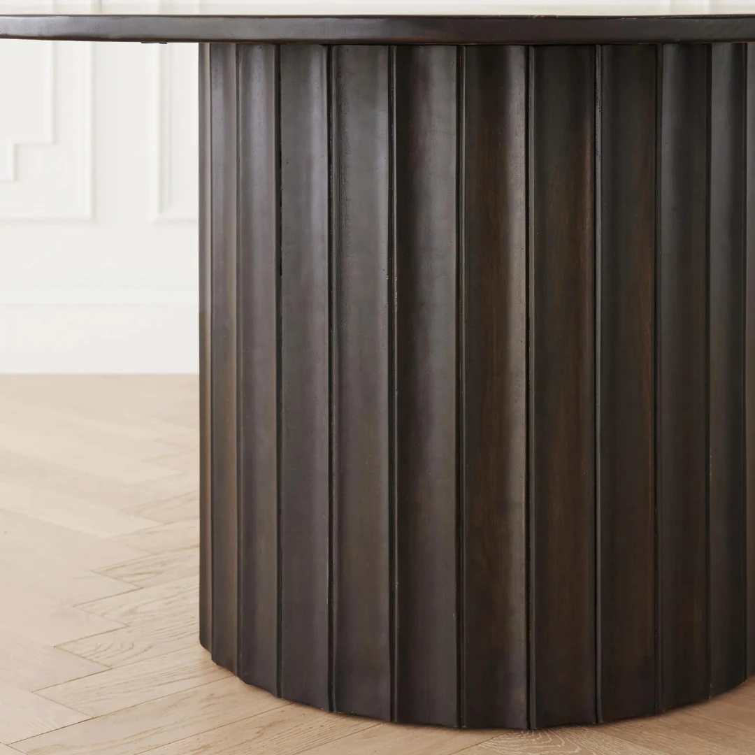 Modern and refined with a hand-rubbed ebony finish, our Dahlia table’s round top is anchored by a fluted pedestal base with ribbed molding.