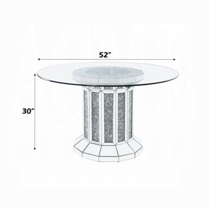The Noralie dining set is the perfect centerpiece for any social gathering. A clear glass top keeps the focus on the sparkling faux diamond inlay of the pedestal table base. Matching side chairs feature curved cabriole legs in a stainless steel finish that complements the reflective mirror trim of the round pedestal table base. Create a chic dining space that radiates dramatic ambience with the Noralie dining set.