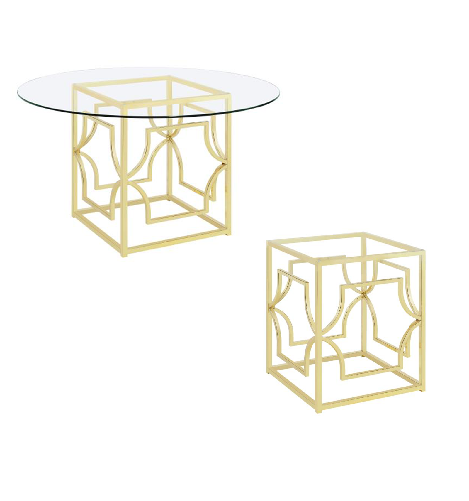 This round dining table creates a refined focal point with its clear tempered glass top and artful geometric base. The sculptural metal frame features intersecting curves and angles, electroplated in a high-shine finish for a bold, contemporary effect. Its open design keeps the space light, while the tempered glass adds a durable, easy-care surface for everyday use or entertaining.