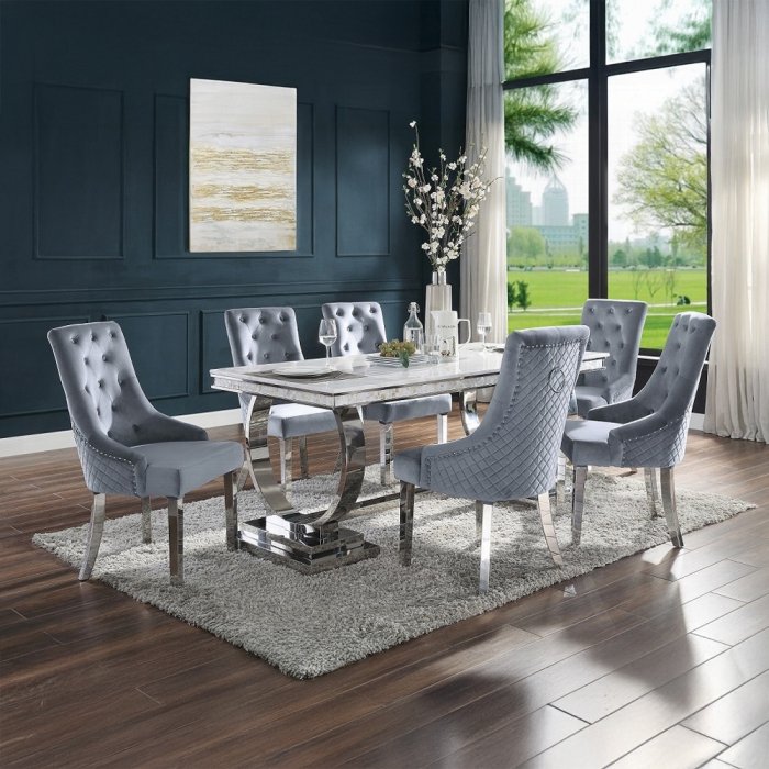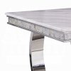 Get your dining guests instantly intrigued by the eye-catching and modern design. Open circle-accented trestle base made of shiny stainless steel is topped with beautiful cultured marble. It's metal frame showcases uncluttered lines and simplicity of this style, with mirrored silver finish emitting a luxurious glitter. Smooth white marble keeps your table top looking fresh and clean, perfect for displaying your cherish dishware. Make over your dining room with this modernist accessory.