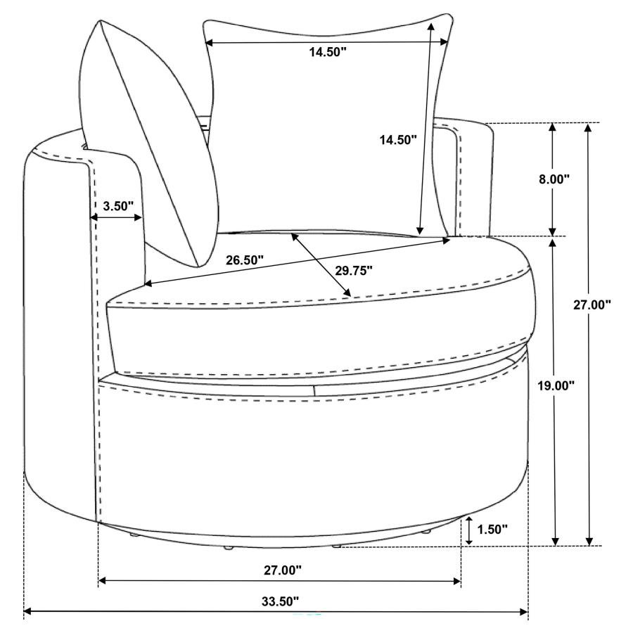 Capture the essence of stylish versatility with a modern swivel accent chair. Perfect for living room or den, it's a compact silhouette with a round frame and pocket coil springs in its foam seat cushion, creating incredible comfort for lounging or entertaining. The chair features a swivel base, adding easy movement and making it a lovely choice for a multi-functional space. Its rounded backrest includes foam cushioning and is complemented with a pair of pillows that bring softness to the overall presentation. Its warm upholstery sets the tone for your space and serves as a stylish neutral to complement surrounding decor choices.