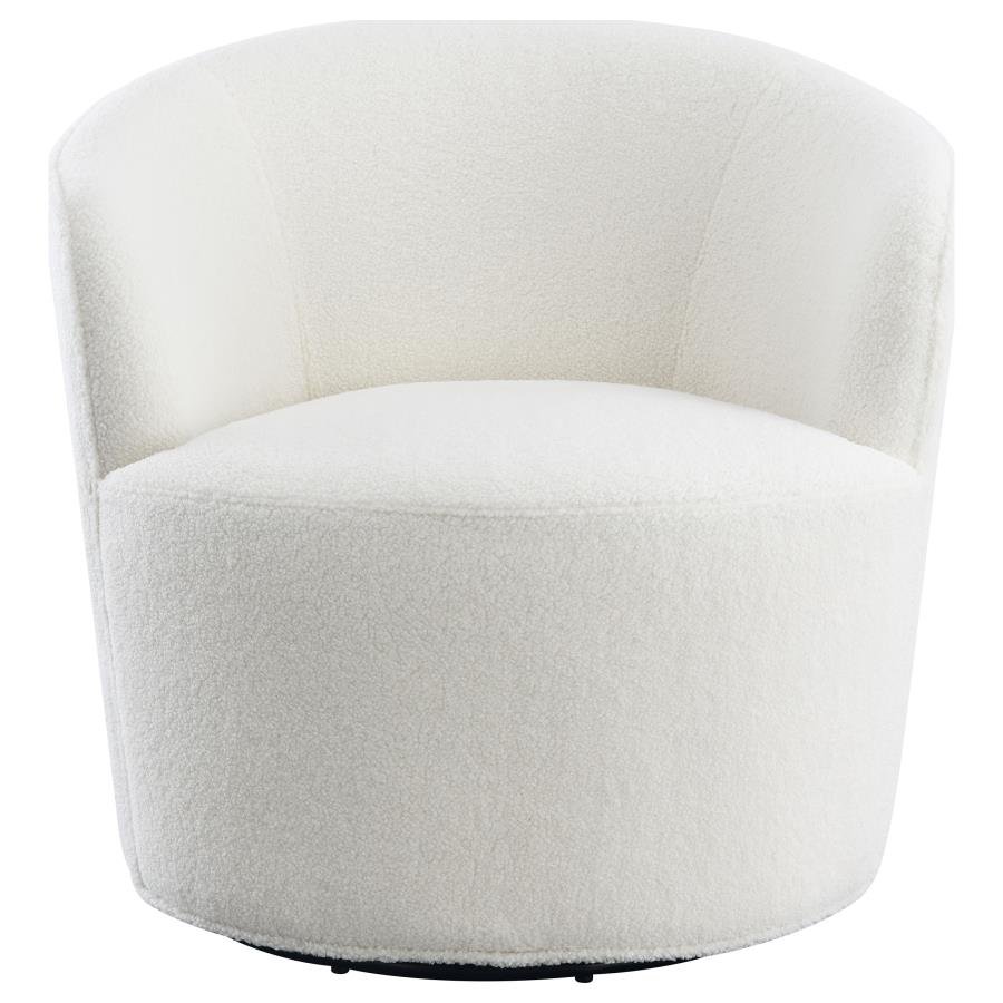 Compact in silhouette but overflowing with style, this contemporary accent chair is a perfect choice for a bedroom or living room sitting area. Its rounded, barrel-inspired silhouette swivels for 360-degree seating perfect for multi-functional spaces. The tight back and seat are upholstered in bright white faux sheep skin that adds soft texture and dimension with an earthy, modern twist. Foam cushioning assure maximum comfort, with webbing support for a firm feel. Perfect for lounging during a video call or catching up with friends and family.