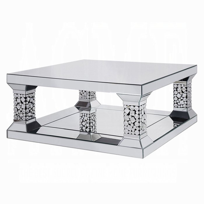 The Kachina Coffee Table will add a contemporary touch to any room in your home. With its clean lines, this brilliant rectangular occasional table showcases a distinctive style for an intriguing look. The table features a fully mirrored beveled frame with mirror base with columns encrusted with a spectacular faux gem inlay. A lower mirrored open shelf provides ample display and storage to keep items tucked out of the way when not in use. This beautiful accent table will modernize any space you place it.