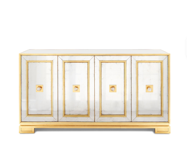 The plinth and moldings of this sideboard, which frame the églomisé panels, are finished in gold leaf. The doors have a raised frame around the center panels on which sit gold backplates to the crystal door pulls.